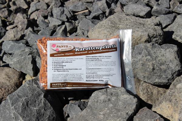 Ergänzungsfuttermittel für Hunde PANYS Karottenpellets sind ein wertvoller Vitamin-, Mineralstoff- und Spurenelemente-Spender. Zusammensetzung: Karotten (Möhren) (davon mind. 100%) werden aus stark karotinhaltigen roten Mohrrüben hergestellt und sind ein 100%iges Naturprodukt. 100g Karottenpellets enthalten 50mg Karotin (Vorstufe zu Vitamin A) und entsprechen 1kg frische Möhren. Außerdem enthalten sie viel Vitamin B. Nach einer Wurmkur kann der Wideraufbau der Darmflora durch Karottenpellets positiv unterstützt werden.Die Analytische Bestandteile bzw. ätherischen Öle der Karotte sind bei Züchtern und vielen Hundeliebhabern bekannt und beliebt (s. Vorteile). Vorteile der Karottenpellets:   Abwehrkräfte steigernd   blutbildend   Stuhl festigend   wurmwidrig   Verbesserung des Haarkleides   Verbesserung der Pigmentierung